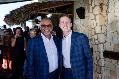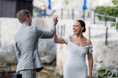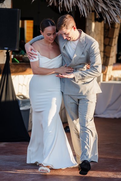 As the sun began its descent toward the Caribbean, the reception came alive. The first dance took place on a terrace at Rockhouse, the couple wrapped around each other with an easy familiarity — heads bowed toward one another, entirely absorbed in the music and the moment, utterly unconcerned with anything else. The warm light caught the fabric of Anna's gown and the weave of Mike's suit in a way that made everything look like it was lit from within.