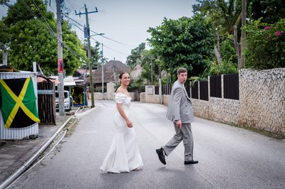 One of the most charming sequences of the day's photographs took the couple out of the hotel grounds entirely and into the streets of Negril itself — a decision that paid off brilliantly.