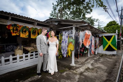 Then came a sequence at one of Negril's roadside market stalls — a riot of colour, with Jamaican flag cloth, tie-dye shirts bearing a famous reggae artist's face, and bright tropical prints hanging from rails. Anna and Mike stood before it all, looking at each other and laughing, the contrast between their elegant wedding attire and the vivid, cheerful chaos of the market stall somehow making everything more beautiful, not less.