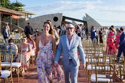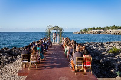 The wide aerial-style shot that captures the full picture is simply breathtaking. The red-stoned ceremonial pier stretches out from the rocky shoreline like a finger pointing toward the Caribbean horizon. On either side, rows of golden chiavari chairs were filled with guests in their colourful finery. At the far end, under a simple arch adorned with arching palm fronds, Anna and Mike stood before their officiant, the vast blue expanse of the Caribbean Sea behind them, an utterly clear sky above.