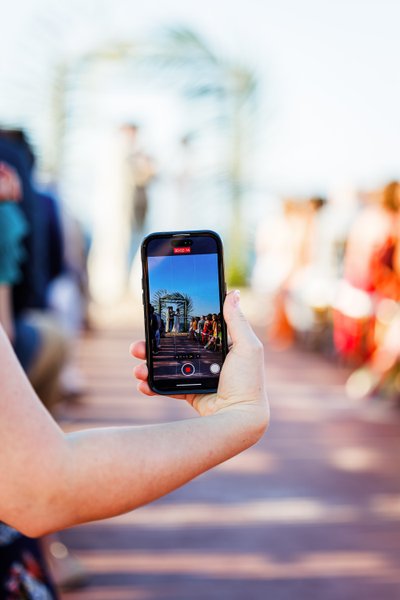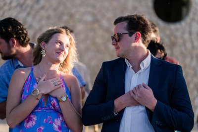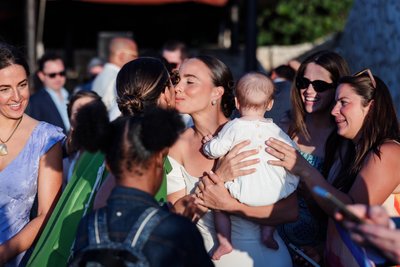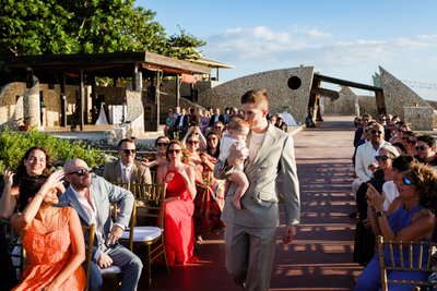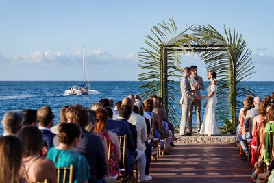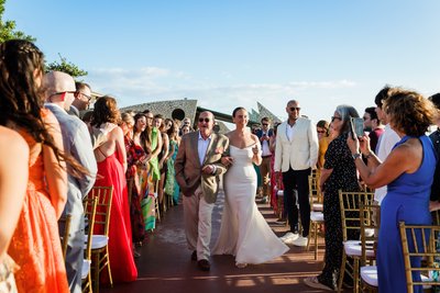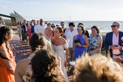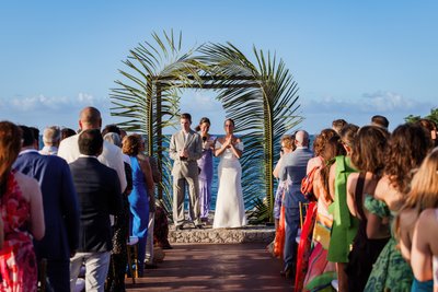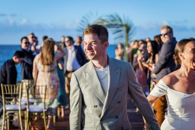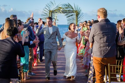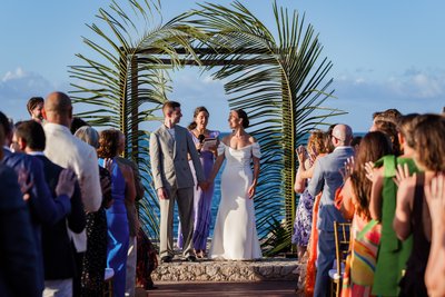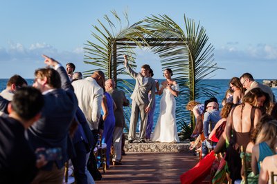The recessional told the same story: Anna and Mike walking hand in hand down the aisle, Mike's hand raised in a wave, Anna's laugh open and wide, guests pressing in from both sides with applause and arms outstretched. Behind them, the palm arch. Beyond that, the sea. It was, by any measure, perfect.