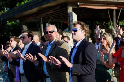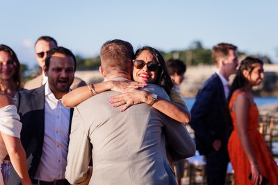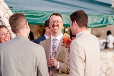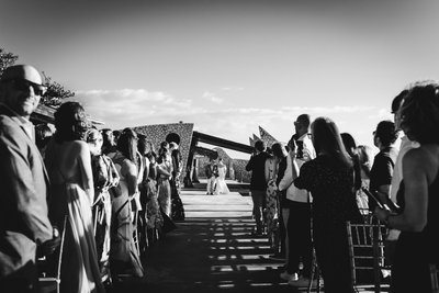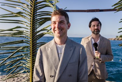 Mike's expression at the altar — hand on head, bent forward in helpless, joyous laughter — tells you everything you need to know about the mood of the ceremony. The officiant, microphone in hand and a wide smile on his face, clearly knew how to hold a room (or rather, a promontory). The ceremony was warm and fun, full of personality.