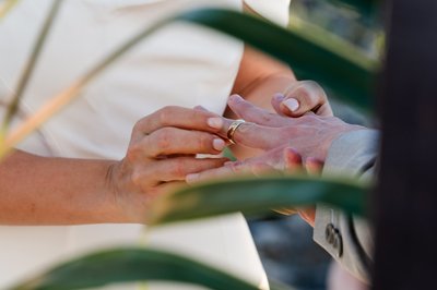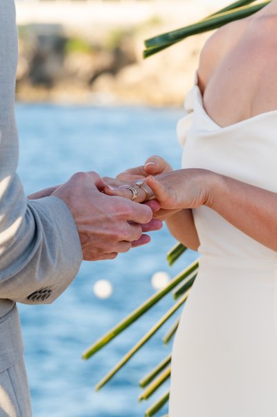 The ring exchange was captured in a close-up that has the quiet intimacy of a poem: two pairs of hands held together, the sea a blur of blue behind them, palm fronds just visible at the edges of the frame, rings catching the late afternoon light.
