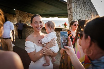 Every wedding has its unexpected moments of grace, and Anna and Mike's had a particularly wonderful one: photographs with their baby, who appeared in the most adorable tiny white dress, lifted high into the air by a delighted Mike while Anna watched, beaming.