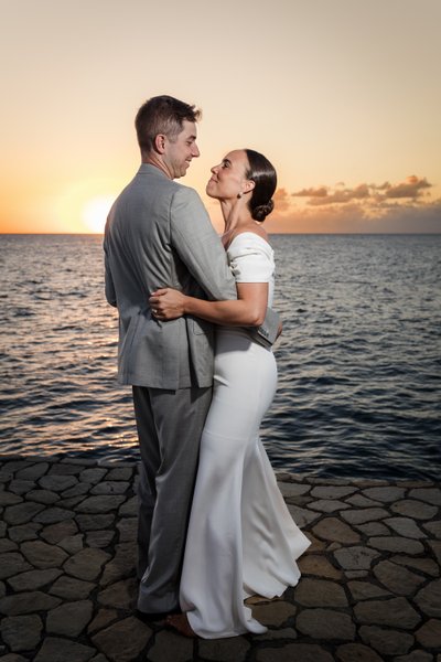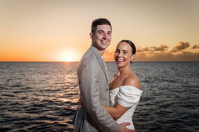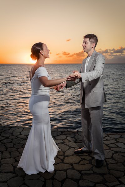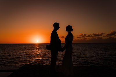 The silhouette photograph — taken at the very moment the sun touched the horizon, flooding the sky with deep, burning orange — is the image that will define this wedding in memory. Two figures standing face to face, hands clasped, their profiles backlit by the most dramatic of skies, the Caribbean dark and glittering beneath it all. It requires no caption. It needs no explanation. It is simply one of the most beautiful wedding photographs you will ever see.