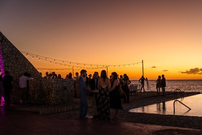 As darkness fell over the Caribbean, Rockhouse transformed. String lights looped across the terrace, casting warm amber glow over guests who moved between the bar, the pool edge, and the cliff railing, drinks in hand, the last traces of orange still burning on the horizon.