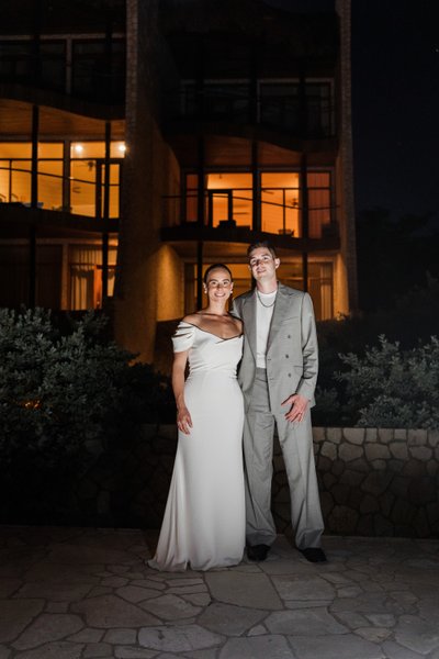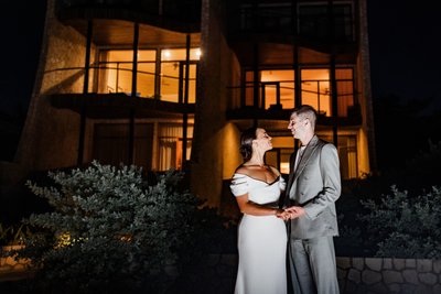 The evening ended with the couple photographed before the illuminated facade of the hotel at night — amber light pouring through the tall windows, the building's striking angular architecture framed by tropical shrubs. Hands held, faces turned toward each other, both smiling. A quiet close to a very full, very beautiful day.