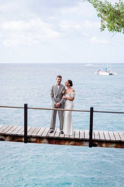 A narrow wooden footbridge spanning a channel of turquoise water became a stage for some of the most romantic images of the day. In one, the couple stood side by side at the railing, the Caribbean stretching behind them, a sailboat visible on the horizon, Anna looking up at Mike with quiet happiness. In another, shot from further back through overhanging trees, they leaned in to share a kiss — Anna's gown caught in the breeze, lifting behind her — while a catamaran passed in the background, as if on cue.