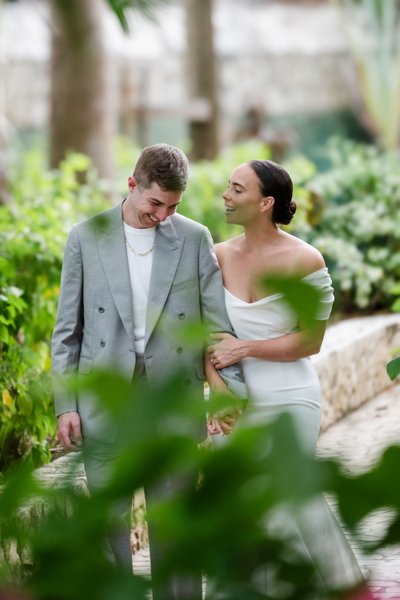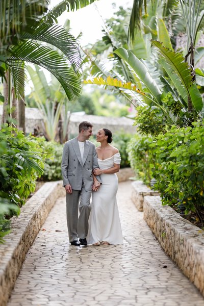 Mike wore a dove-grey double-breasted suit — a choice that felt both thoroughly modern and appropriately relaxed for a Caribbean wedding. Worn over a white crew-neck tee rather than a formal dress shirt, it had a laid-back confidence that suited both the venue and the man. A gold chain at the neck was the only jewellery. He looked sharp without trying too hard, and together they made a strikingly handsome pair.