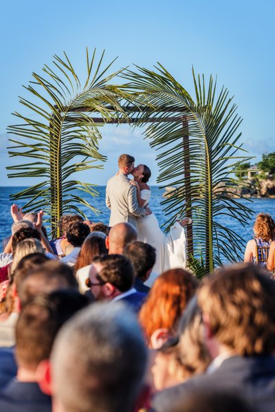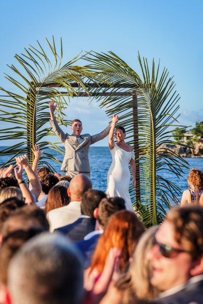 Then: the moment it was official. Both arms raised. Mouths open in celebration. The crowd on their feet, waving and cheering. The arch of palm fronds framing the newly married couple against the Caribbean sky. It is one of those photographs that makes your chest expand just looking at it. Pure elation.