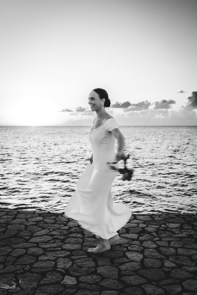 A black-and-white image of Anna alone — barefoot now, moving freely across the stone waterfront, dress swirling, bouquet held loosely, smile caught in profile against the luminous sky — captures something equally moving: a woman at the height of happiness, free and radiant, fully present in the best day of her life.