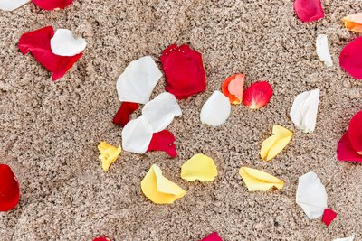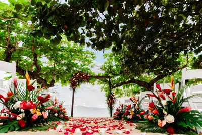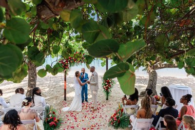 In color, the ceremony takes on an entirely different energy — warm, saturated, and full of life. The wide shot of the ceremony in progress, taken from behind the guests and looking toward the altar, shows the couple at the center of a frame overflowing with visual richness: the overhanging sea grape branches above, the tropical floral arrangements flanking the altar, the scattered petals covering the sand, the guests leaning in on either side, and the blue of the Caribbean visible behind the altar in the gap between the trees. It is a composition that has everything — foreground, midground, background, color, texture, and two people at the center of it all who clearly mean every word they are saying.