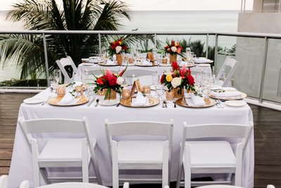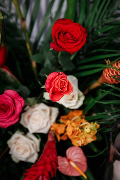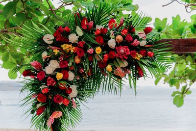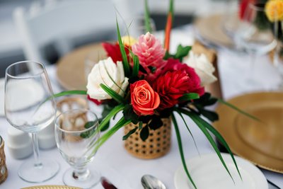 The tropical color palette — vivid red, deep orange, hot pink, and rich green against crisp white and warm gold — was executed consistently from the ceremony florals to the reception centrepieces to the bridal bouquet to the cake flowers. The centrepieces on the guest tables were compact but striking: bouquets of coral and red roses, pink ginger, and tropical greenery in woven gold containers, set against white linens and gold charger plates. Every detail was deliberate, and the cumulative effect was a wedding that felt both luxurious and completely alive — not the muted, soft-focused palette of many destination weddings, but something bolder and more honest about the place it was celebrating.