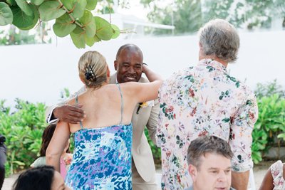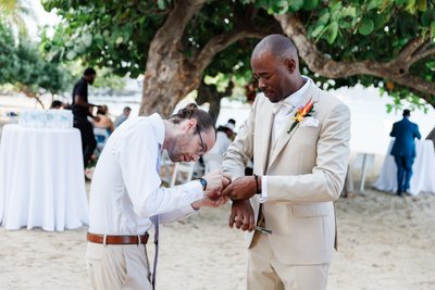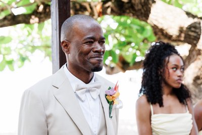 Ian's cream three-piece suit with its white bow tie was exactly right — warm enough to belong completely on a Jamaican beach in the morning, sharp enough to hold its own against a dramatic rooftop dinner at sunset. His boutonniere, a tropical mixed bloom in orange and pink with greenery, echoed the wedding's palette perfectly.