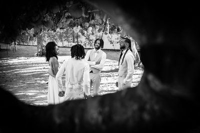 In one of the most quietly atmospheric images of the ceremony, the photographer pulled back and shot through the frame of the sea grape foliage — a black-and-white composition that shows the wedding party gathered in the dappled light beneath the trees, figures small against the expanse of sand, their white outfits luminous in the soft morning brightness. The framing through the leaves gives it the quality of something witnessed rather than staged — a glimpse through the canopy at something private and real. It is a photograph of remarkable compositional intelligence.