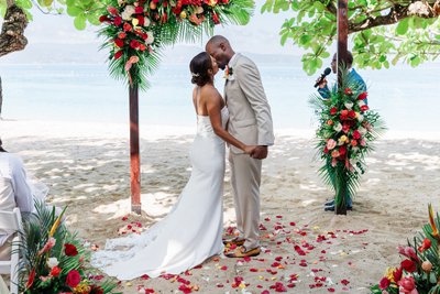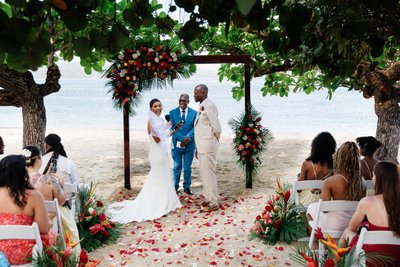 It is a ceremony space created entirely by nature and art in equal measure. The trees were not planted for this wedding; they have been growing on this beach for decades, perhaps longer. But the florals, the petals, the careful arrangement of every element along that sandy aisle — that was the work of people who understood exactly what they had to work with and made the very most of it. The result is one of the most photographically compelling ceremony setups in any wedding in this collection: lush, joyful, abundant, and completely, irreducibly Jamaican.