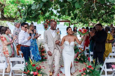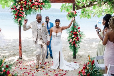 Natalia, her strapless sweetheart-neckline gown with its lace detailing catching the morning light, raised her tropical bouquet — a vivid, exuberant arrangement of red roses, orange blooms, anthuriums, orchids, and tropical leaves — high above her head with one arm as she and Ian walked back down the aisle together. The bouquet-raise was matched perfectly by Ian's own arm lifted in a fist pump of pure celebration, his head bowed slightly with the weight of the emotion he was clearly feeling. Behind them, the officiant in his blue suit beamed. The tropical floral arch blazed with color against the sea. The guests leaned in on either side. The petals on the sand were trampled now, scattered by feet that had been doing the same thing — celebrating — all morning long.