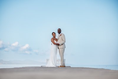 After the ceremony, as the morning moved into the clear, bright Caribbean midday, the couple took their portraits on the beach and on the hotel's jetty — and the images that resulted are among the most purely beautiful in the entire gallery.