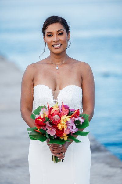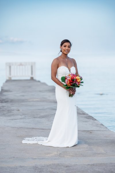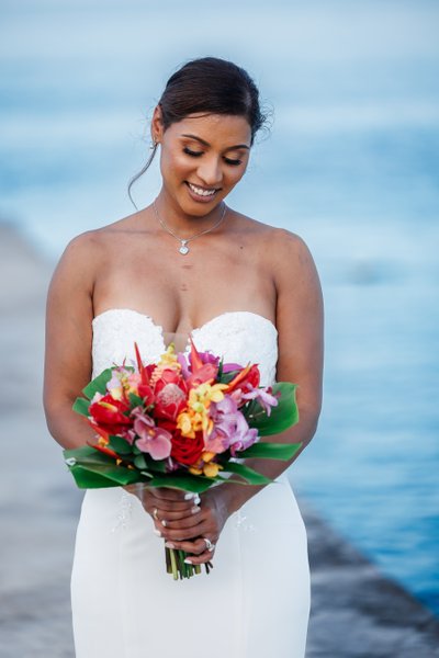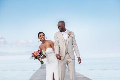 In the closer jetty portraits, the intimacy returns. The couple face each other, hands clasped between them, Natalia's smile lit from within as she looks up at Ian. In another, they walk together back along the pier, laughing at something between them, completely at ease. And in the bride's solo portrait — taken with the calm turquoise sea as a backdrop, her gaze cast softly downward at the tropical bouquet she holds with both hands — Natalia is simply luminous: poised, beautiful, content, the whole Caribbean shimmering soft and blue behind her.