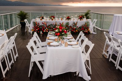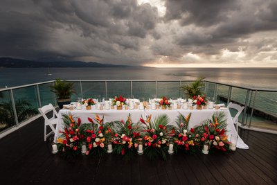 The photographs of the reception setup shot against this sky are some of the most visually arresting detail images any wedding photographer could hope to capture. The head table on the dark-wood deck, dressed in a long white cloth with a running base of tropical florals — red ginger, bird of paradise, anthurium, white roses, palm fronds, and candles interspersed throughout — stretches toward the glass railing beyond which the bay and the mountains and that extraordinary sky fill the entire frame. The contrast between the meticulous earthly beauty of the floral arrangements and the wild, untamable grandeur of the sky above them is startling and magnificent.