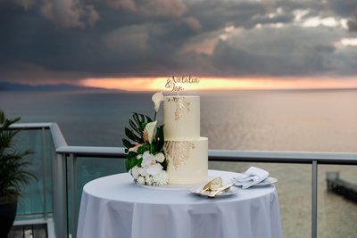 The wedding cake — a two-tiered ivory confection decorated with gold leaf brushwork and adorned with a side arrangement of calla lilies, orchids, and monstera — was photographed on its cocktail table with the sunset horizon directly behind it: the cake topper reading Natalia & Ian in warm gold script silhouetted against a sky of amber and pewter. It is the kind of photograph that turns a beautiful detail into something almost mythic.