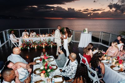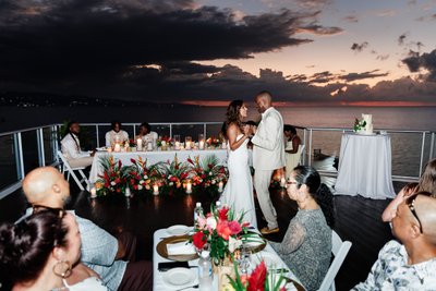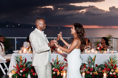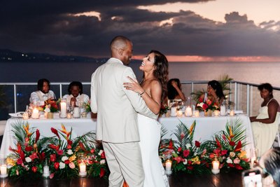 As Ian and Natalia danced on the rooftop deck above Montego Bay, the sky behind them was in full, dramatic transition from the last light of sunset into the deep violet and rose of tropical dusk. The storm clouds had spread across the sky but not quite closed it, leaving bands of color along the horizon that turned the entire bay and the distant coastline into something from a dream. The candlelit floral arrangements glowed warm along the base of the head table. The guests watched from their seats, leaning in.