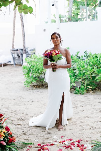 Natalia's gown was a masterpiece of elegant restraint — a fitted, strapless sweetheart-neckline sheath with delicate lace detailing along the bodice and a clean, modern train. It had real presence without overwhelming its wearer, and it moved beautifully through every context the day placed it in: the sandy aisle under the sea grapes, the jetty above the turquoise water, the rooftop dance floor with the Caribbean sky behind her.