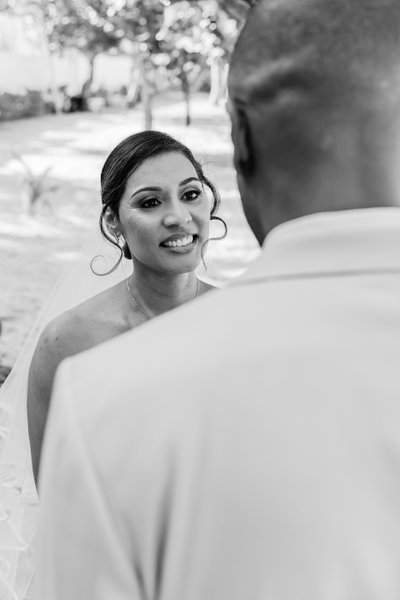 The close-up portraits from the ceremony are equally telling. In one, Natalia looks up at Ian during the vows with an expression of complete, radiant happiness — the particular smile of someone who is not performing for anyone, who has simply arrived at the moment they were building toward and is feeling it fully. Ian, tall and composed in his beautifully tailored cream three-piece suit with its white bow tie and tropical boutonniere, looks back at her with the steady warmth of a man who knows exactly what he has.
