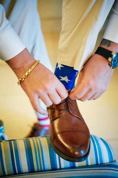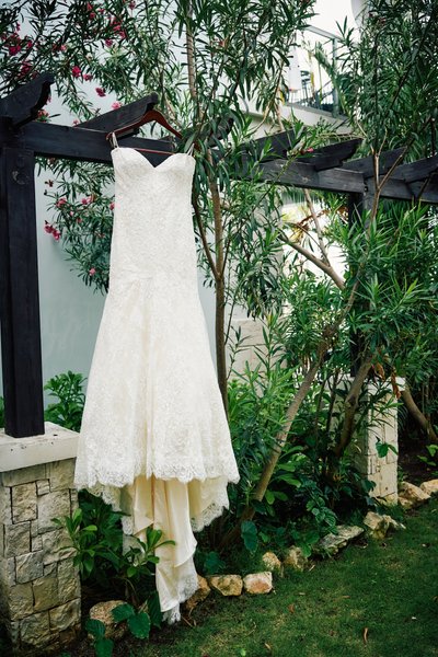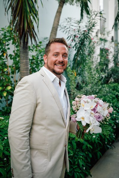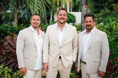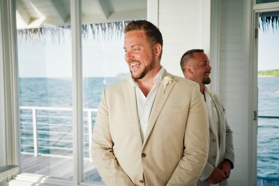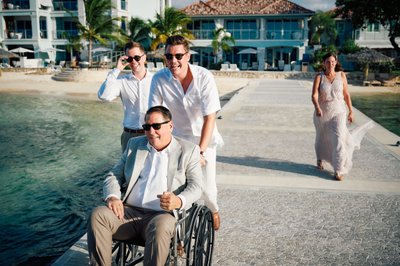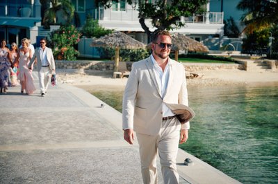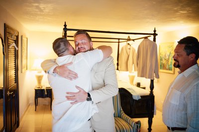 Meanwhile, across the resort, Jayson was getting ready in the company of his groomsmen. Two of his closest friends helped ease him into his ivory linen jacket — a scene photographed in the warm lamplight of a classic Sandals villa room, the four-poster bed and shuttered windows giving it a colonial Caribbean charm. Jayson looked down with quiet concentration, being readied by the people who matter most. The simplicity of the moment belied the magnitude of what was coming.