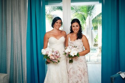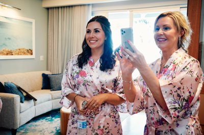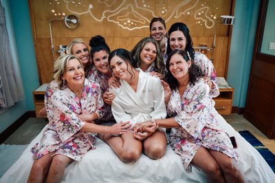 The day began with the particular kind of electricity that only a wedding day carries. In the beautifully appointed suite at Sandals Montego Bay, Lindsey and her bridesmaids gathered in their matching floral satin robes — soft pink with flowers in purple, blush, and green — a visual that perfectly captured the feminine, relaxed energy of the morning.