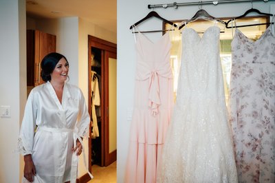 One of the most charming photographs of the getting-ready sequence shows Lindsey appearing at the doorway in her white bridal robe, beaming at her bridesmaids who are turned toward her with their backs to the camera. It is a moment of pure anticipation — the bride arriving into the room, her smile wide, her girls already in full celebration mode. The wedding gown and bridesmaid dresses hang neatly in the background, waiting their turn.