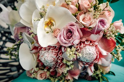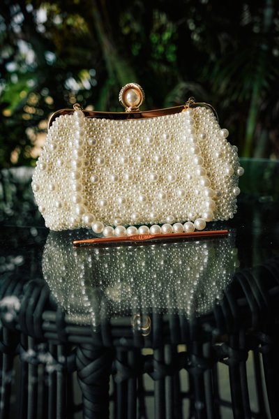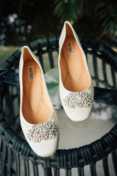 The details were just as carefully considered. Lindsey's bridal shoes — elegant Badgley Mischka crystal-embellished flats in ivory satin — were photographed on a wicker table against a lush tropical backdrop, their oversized jeweled brooches catching the light. A practical and beautiful choice for a beach wedding, and a detail that told you everything you needed to know about Lindsey's approach to the day: glamorous, but grounded.