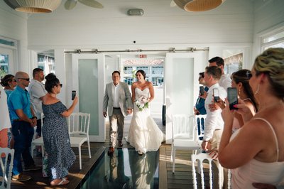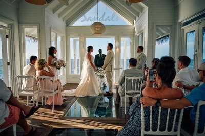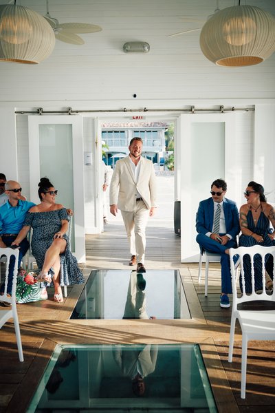 Inside the chapel, the scene was every bit as magical as the exterior promised. The ceremony space is intimate — a dozen or so white Chiavari chairs arranged on either side of a central aisle, the walls lined with tall windows and open French doors that frame the sea on every side. Light flooded in from all directions, and through the glass floor panels beneath the couple's feet, the Caribbean shimmered in shades of teal and blue.