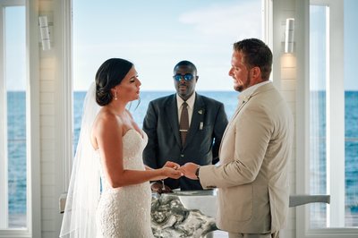 Lindsey stood in her strapless lace gown, its intricate floral lace pattern trailing into a cathedral-length train that pooled on the wooden floor around her. Jayson, beside her in his ivory linen suit and open white dress shirt, faced her with the kind of smile that starts in the eyes. Their officiant stood before them, the open sea stretching behind through the chapel's back doors — a frame within a frame, the ocean serving as the most magnificent altar backdrop imaginable.