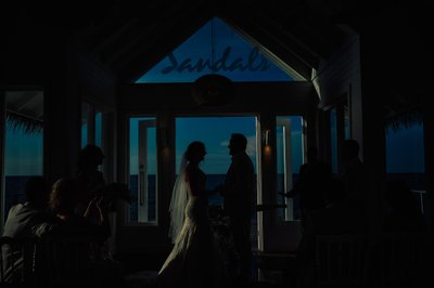 In another extraordinary frame — likely the single most artistically striking photograph of the wedding — the chapel interior is rendered almost entirely in silhouette. The couple stands face to face at the altar, the brilliant blue of the sea and sky pouring through the windows behind them, the Sandals script visible in the gable above. It is a photograph of pure romance, stripped of detail and reduced to its absolute essence: two people, the light between them, and forever on the other side of those windows.