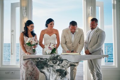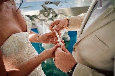 The photograph captures it in exquisite close-up detail: four hands working together over the braided white cord, the officiant guiding the knot as Lindsey and Jayson's fingers intertwine around it. Her delicate chain necklace falls forward, his gold bracelet catches the light, and the glass floor of the chapel reveals the turquoise water moving quietly beneath their feet. It is one of those rare ceremony photographs where you can feel the weight of the moment — the deliberateness of it, the intention, the intimacy of two people quite literally tying themselves to one another.