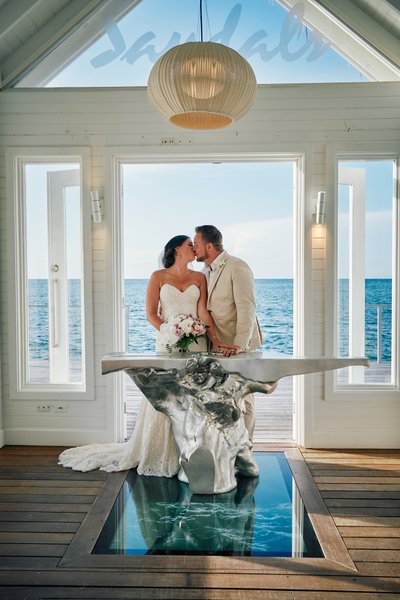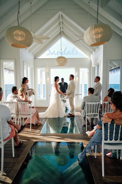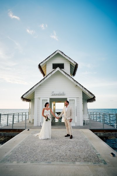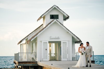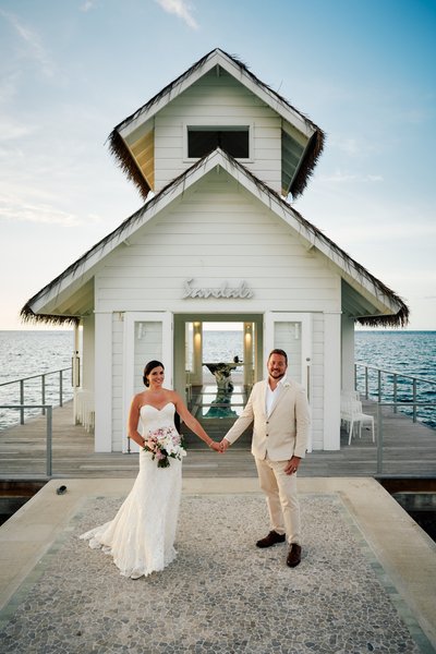 There is a small white chapel that sits at the end of a pier, surrounded entirely by the Caribbean Sea. It has a bell tower, a thatched roof, and a glass floor through which you can watch the water move beneath your feet as you say your vows. It is, by almost any measure, one of the most extraordinary places on earth to get married. And that is exactly where Lindsey and Jayson chose to begin their forever.