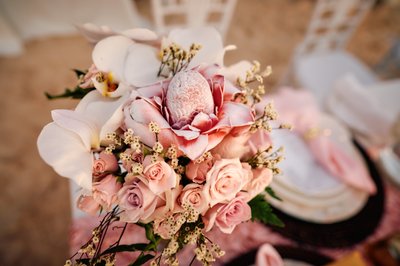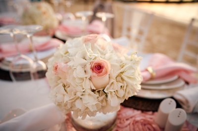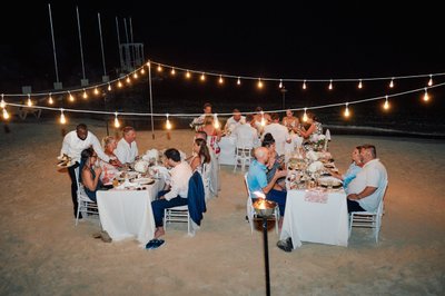 As darkness fell over Sandals Montego Bay, the beach was transformed into an open-air reception that felt like something from a dream. Long white-draped dining tables were arranged on the sand, set with floral centerpieces of white hydrangeas and soft blooms, glassware catching the candlelight, and taper candles rising from the settings. Above it all, strings of warm Edison bulb lights were strung between poles, creating a canopy of soft golden light that turned the night sand into something glowing and intimate.