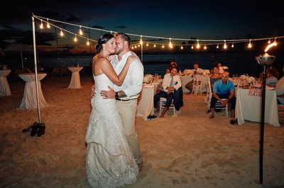The first dance took place right there on the beach — Lindsey and Jayson, barefoot on the sand, holding each other close as the last light of the Jamaican evening turned the ocean behind them into a ribbon of deep blue and orange. The string lights above them, the tiki torches flanking the scene, the guests watching from their tables — it was the kind of first dance that no ballroom could ever replicate.