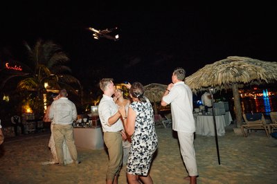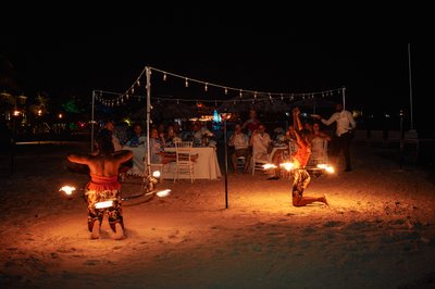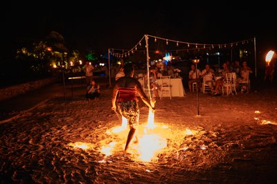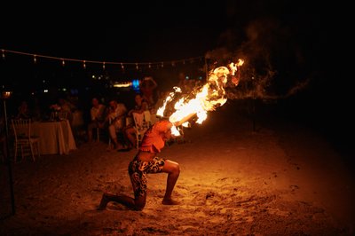 The evening then delivered one of the most memorable surprises of the night: a fire dancing performance. Two performers — one kneeling, one leaping — moved in synchronized arcs of flame across the sand, their fire batons and hoops leaving trails of orange light in the darkness. The guests watched from their tables, phones raised, utterly captivated. It was a quintessentially Caribbean gift to the reception — unexpected, thrilling, and completely unforgettable.