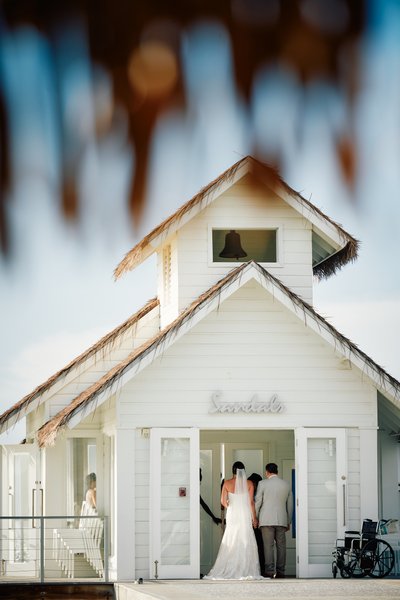As the ceremony hour approached, a second photograph captured Lindsey and Jayson entering the chapel together, seen from a distance through the soft blur of palm fronds. Lindsey's long lace train trailed behind her as the two stepped through the chapel's white double doors, the bell in the tower above them silent but watchful. It is a photograph that holds its breath.