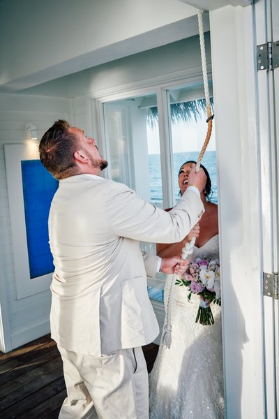 After the vows were sealed, Lindsey and Jayson stepped outside to ring the chapel bell — a Sandals tradition that announces to the world, and to the sea, that a marriage has just been made. The photograph shows them both pulling the rope with full-bodied effort and full-bodied laughter, the joy of the moment completely uncontainable.