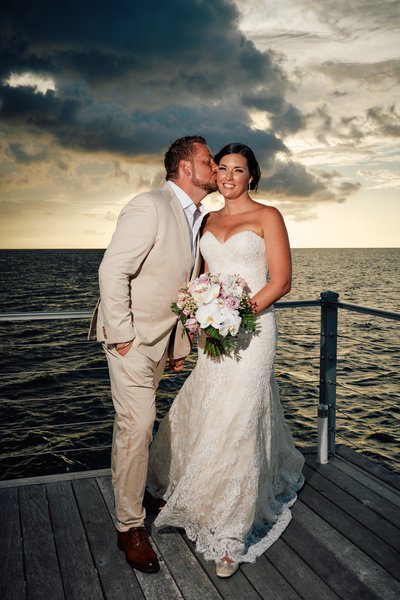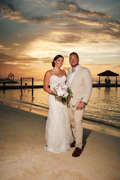 Standing on the pier directly in front of the chapel, with the white building behind them and the Caribbean stretching wide on both sides, Lindsey and Jayson are luminous. She carries her bouquet of white orchids, blush roses, and lavender blooms — soft, romantic, and perfectly Jamaican. He looks at her with barely concealed delight. They are both grinning. The chapel, the sea, the sky — it is a portrait that could hang in a gallery.