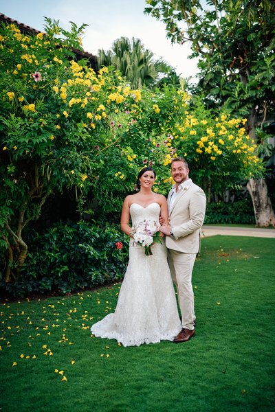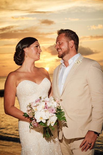 In the resort gardens, surrounded by an explosion of yellow trumpet flowers in full bloom — the thick, vivid green of the Jamaican countryside filling every corner of the frame — they stand together on a carpet of petals, laughing at something only they know. And then, as the sun began its descent over the Caribbean, they found themselves on the beach in what became the photograph of the day: the two of them face to face, her bouquet between them, the sky behind them on fire with gold and orange and rose. That sunset portrait is the kind of image that reminds you why destination weddings in Jamaica are in a category entirely their own.