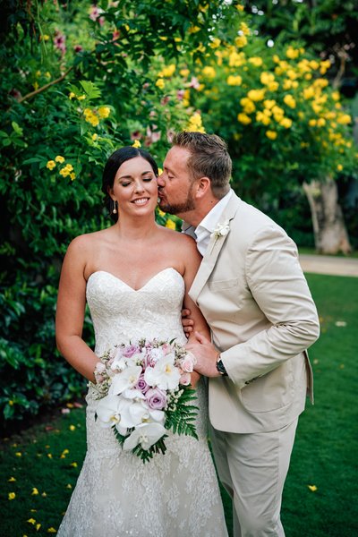 On the resort's wooden bridge, framed by swaying coconut palms and the lush tropical canopy of the property's gardens, the couple lean into each other — Jayson pressing his cheek gently to Lindsey's, both smiling softly. It is quieter, more private, more tender. The kind of portrait that feels stolen rather than posed.